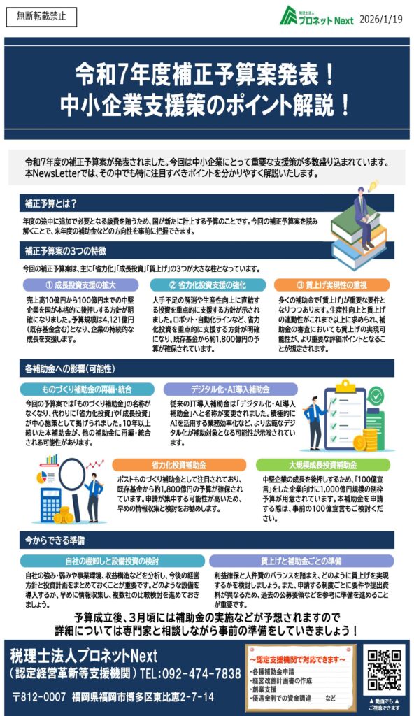 【令和7年度補正予算案】が発表されました 2026年1月19日 最終更新日時 : 2025年12月24日 pn2503y 令和7年度の補正予算案が発表されました。今回は中小企業にとって重要な支援策が多数盛り込まれています。 下記画像をクリックすると、詳細をご確認いただけます。